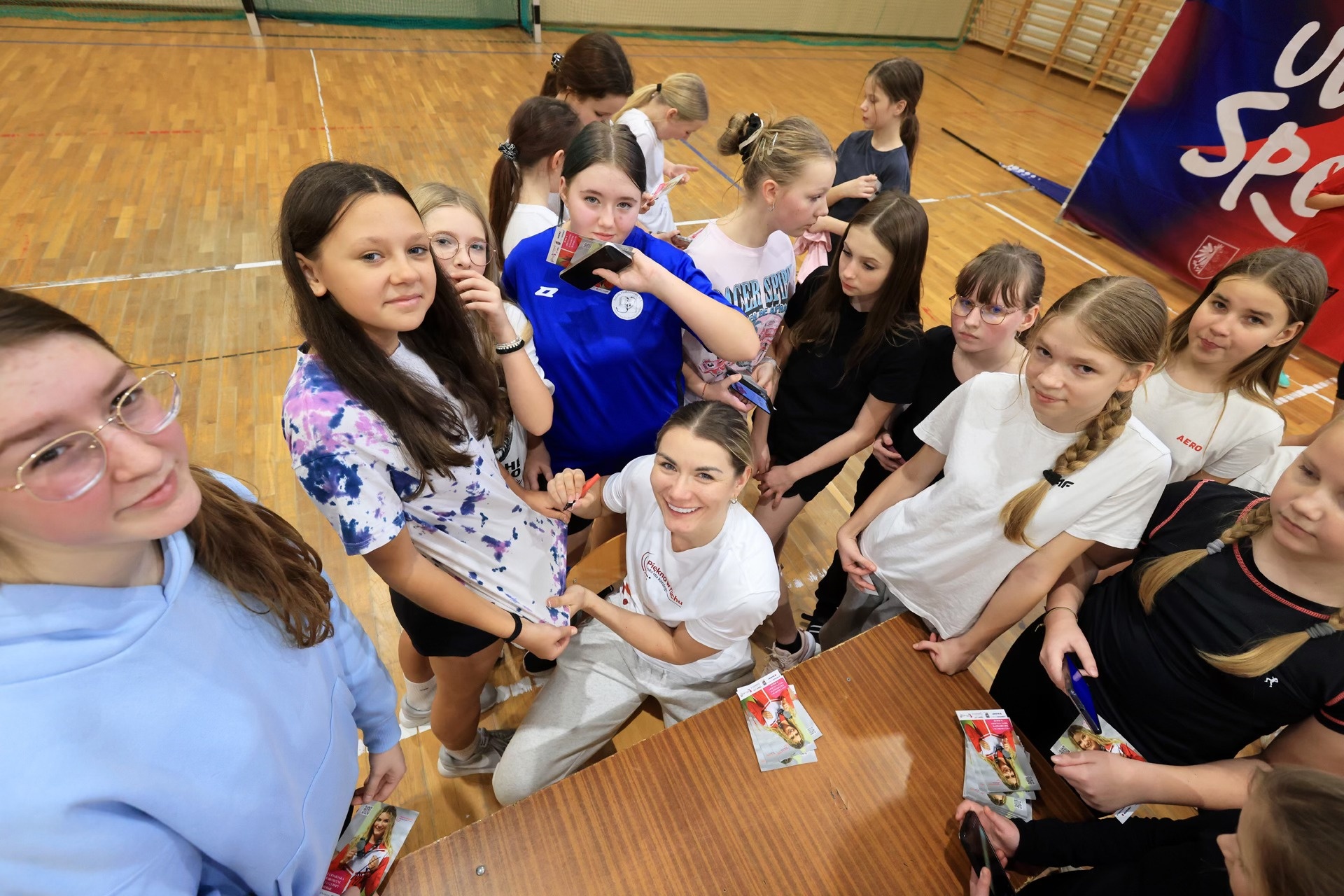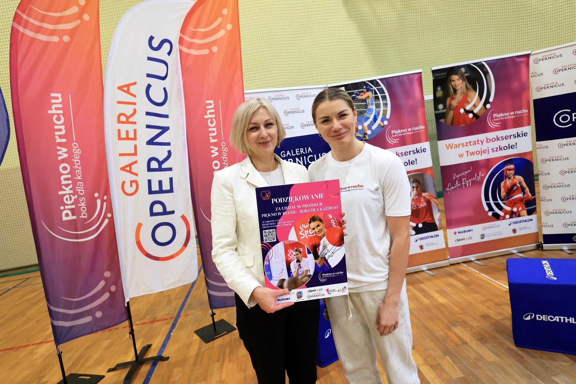 5. „Piękno w ruchu – boks dla każdego”- W nasze mury zawitała Aneta Rygielska, wicemistrzyni świata, olimpijka z Paryża, dwukrotna wicemistrzyni Europy oraz ośmiokrotna mistrzyni Polski w boksie. Nasz gość wraz ze swoim sztabem realizował autorską akcję „Piękno w ruchu – boks dla każdego”. Program jest skierowany wyłącznie dla dziewczyn i skorzystało z niego blisko 100 uczennic. Spotkanie rozpoczęło się od ciekawej rozmowy, podczas której Pani Aneta odpowiadała na każde pytanie zadane przez uczestniczki pogadanki. Dziewczęta dowiedziały się wielu ciekawych rzeczy na tematy związane z karierą, dyscypliną oraz życia codziennego zawodowego sportowca. Po dawce motywacji przyszedł czas na aktywność fizyczną. Nasze uczennice po bokserskiej rozgrzewce z ogromnym zaangażowaniem przystąpiły do poznawania techniki ciosów i pracy nóg. Kolejnym etapem bokserskiego treningu była praca na stacjach. Na koniec przyszedł czas na wspólne zdjęcia oraz autografy. Dziewczęta gromkimi brawami pożegnały trenerów oraz mistrzynię, która okazała się nie tylko jednym z najlepszych sportowców na świecie, ale także otwartym i pozytywnym człowiekiem.